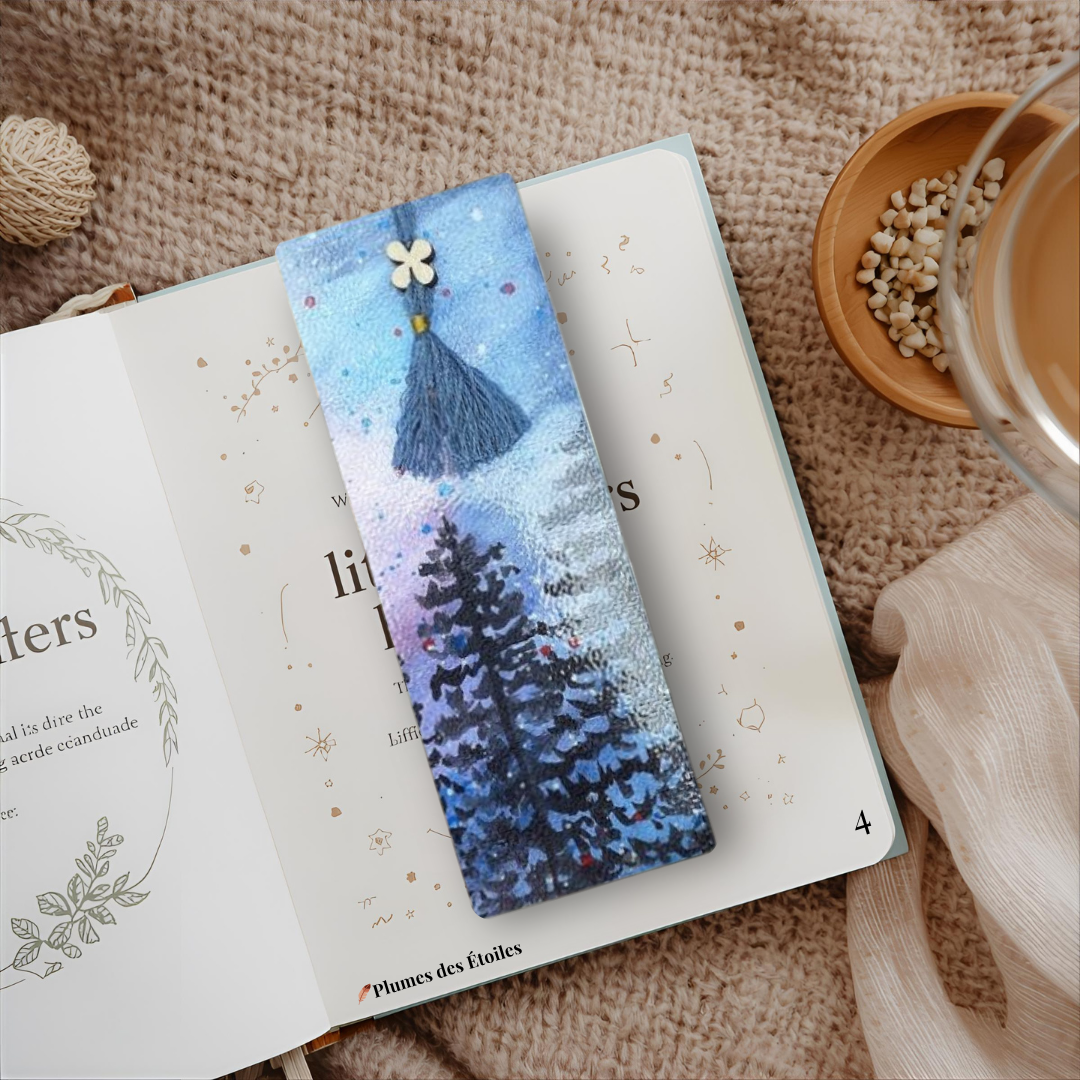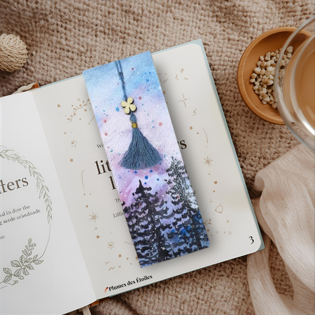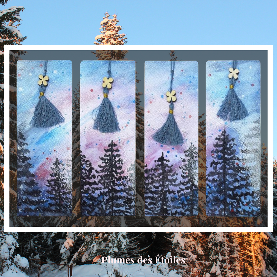 - ✨ 4 marque-pages artisanaux — chacun avec une illustration unique de sapins au crépuscule