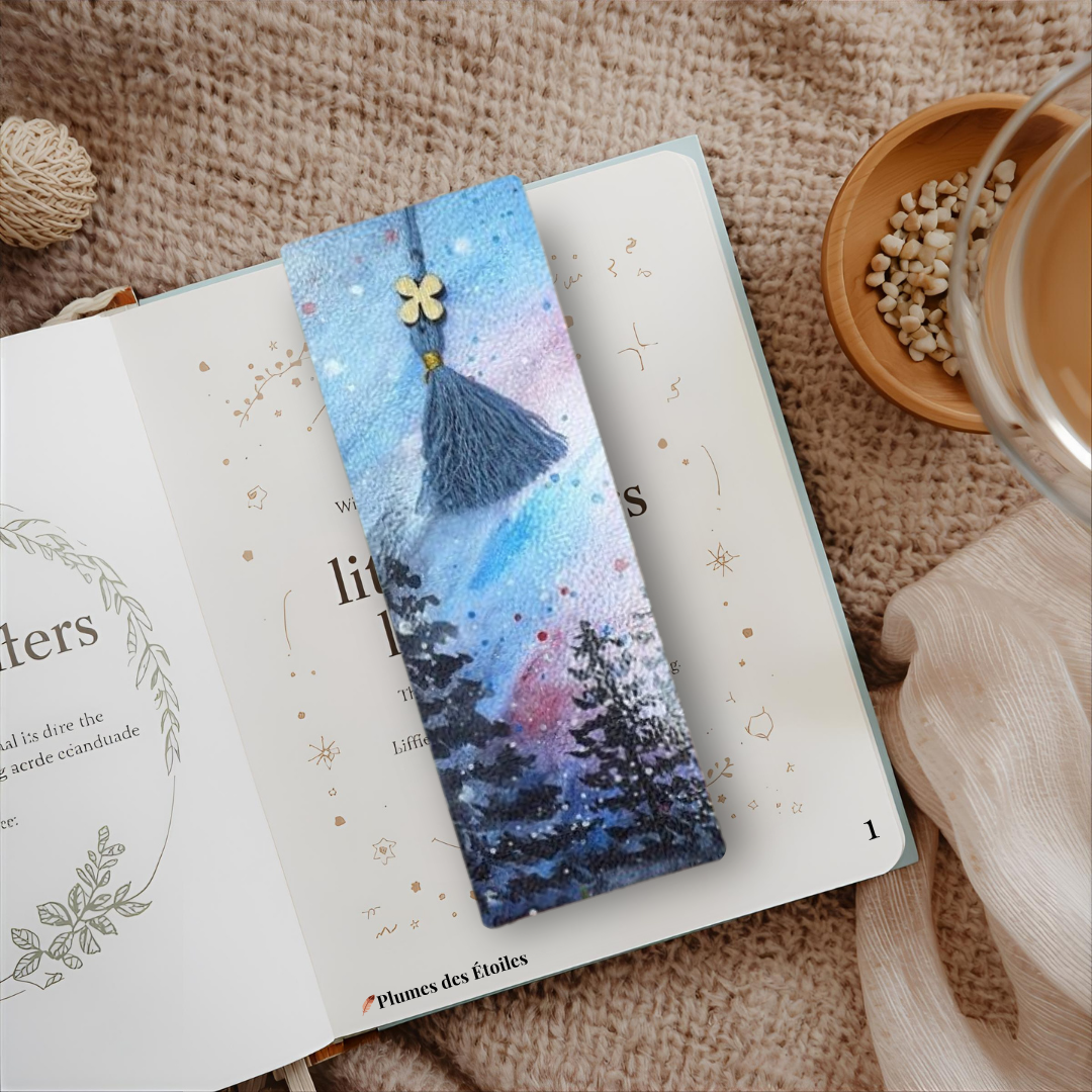 L’Ensemble de 4 Marque-Pages Sapins Enchantés s’inspire de la beauté mystérieuse des forêts au crépuscule et de la magie de la technique aquarelle. Chaque création célèbre la nature, la créativité et l’artisanat — pour celles et ceux qui cherchent une collection d’accessoires raffinés, authentiques et porteurs de poésie forestière au quotidien.
