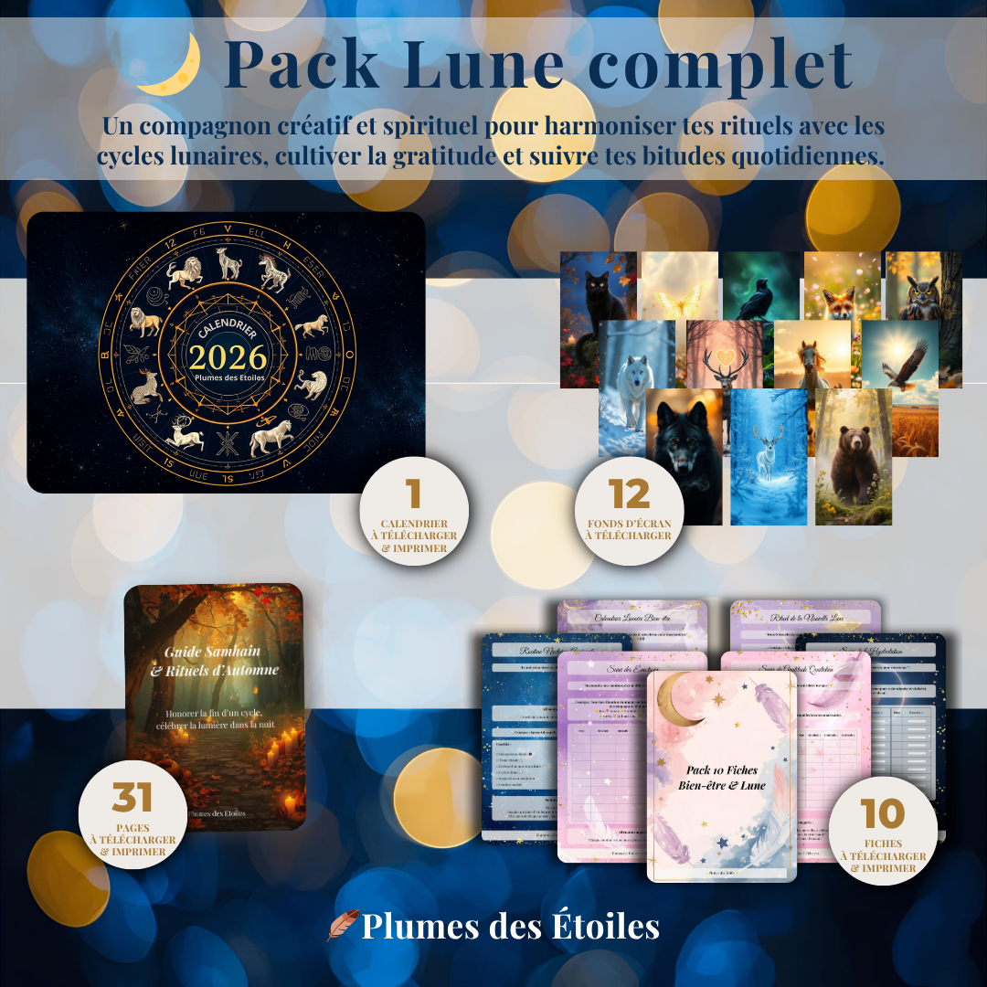 - Pack Lune Complet : fiches + calendrier + fonds d’écran + Guide Samhain (économise 24%)